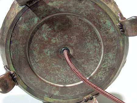 The suface of the lamp base and sockets are patinated with brown /dark green- brown Tiffany patina made in our Studio using the original recipe handed down by Tiffany Studios New York. No lacquer is used in the patination process.