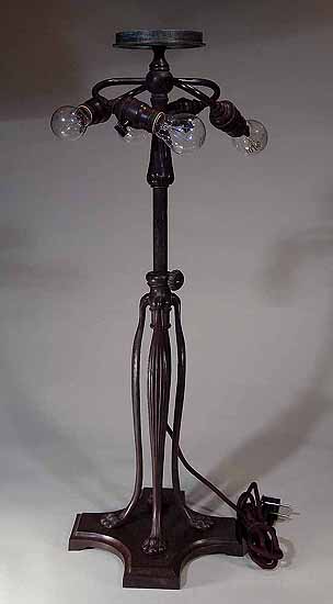 Other standards of electrification are available at no extra cost. The suface of the lamp base and sockets are patinated with brown /dark green- brown Tiffany patina made in our Studio using the original recipe handed down by Tiffany Studios New York. No lacquer is used in the patination process.