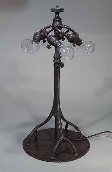 The suface of the lamp base and sockets are patinated with brown /dark green- brown Tiffany patina made in our Studio using the original recipe handed down by Tiffany Studios New York. No lacquer is used in the patination process.