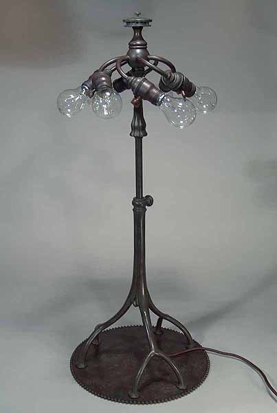 The suface of the lamp base and sockets are patinated with brown /dark green- brown Tiffany patina made in our Studio using the original recipe handed down by Tiffany Studios New York. No lacquer is used in the patination process.