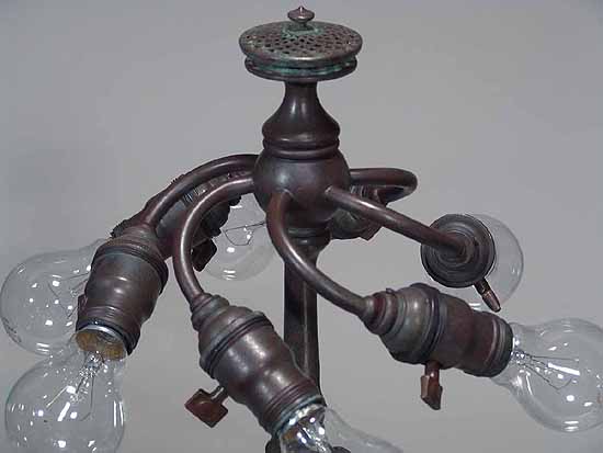 The suface of the lamp base and sockets are patinated with brown /dark green- brown Tiffany patina made in our Studio using the original recipe handed down by Tiffany Studios New York. No lacquer is used in the patination process.