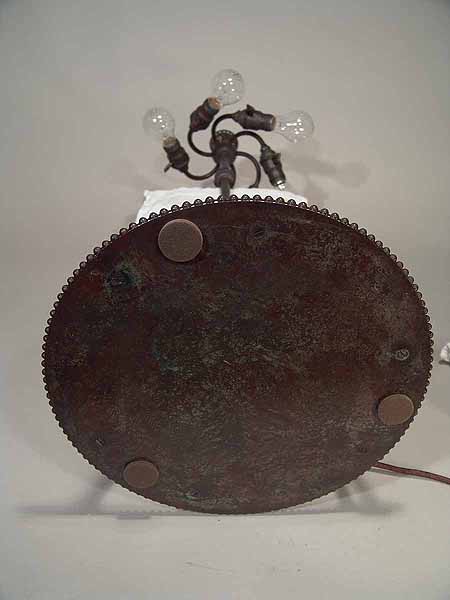 The suface of the lamp base and sockets are patinated with brown /dark green- brown Tiffany patina made in our Studio using the original recipe handed down by Tiffany Studios New York. No lacquer is used in the patination process.