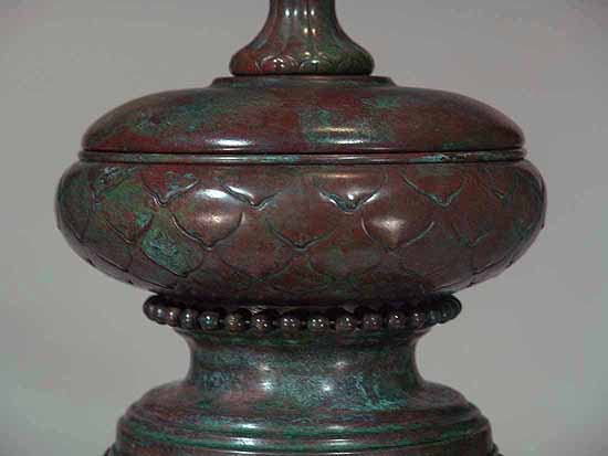 The suface of the lamp base and sockets are patinated with brown /dark green- brown Tiffany patina made in our Studio using the original recipe handed down by Tiffany Studios New York. No lacquer is used in the patination process.