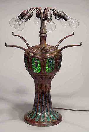 The suface of the lamp base and sockets are patinated with brown /dark green- brown Tiffany patina made in our Studio using the original recipe handed down by Tiffany Studios New York. No lacquer is used in the patination process.