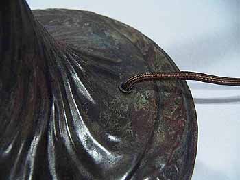 The suface of the lamp base and sockets are patinated with brown /dark green- brown Tiffany patina made in our Studio using the original recipe handed down by Tiffany Studios New York. No lacquer is used in the patination process.