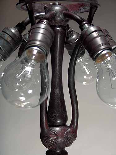 The suface of the lamp base and sockets are patinated with brown /dark green- brown Tiffany patina made in our Studio using the original recipe handed down by Tiffany Studios New York. No lacquer is used in the patination process.