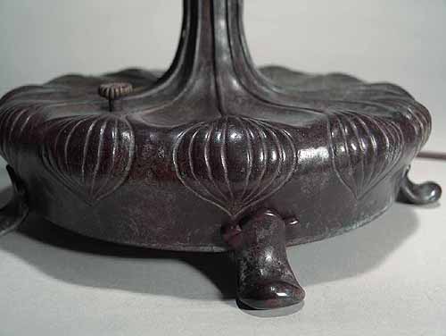 The suface of the lamp base and sockets are patinated with brown /dark green- brown Tiffany patina made in our Studio using the original recipe handed down by Tiffany Studios New York. No lacquer is used in the patination process.
